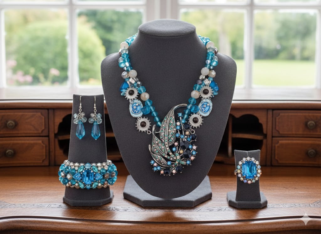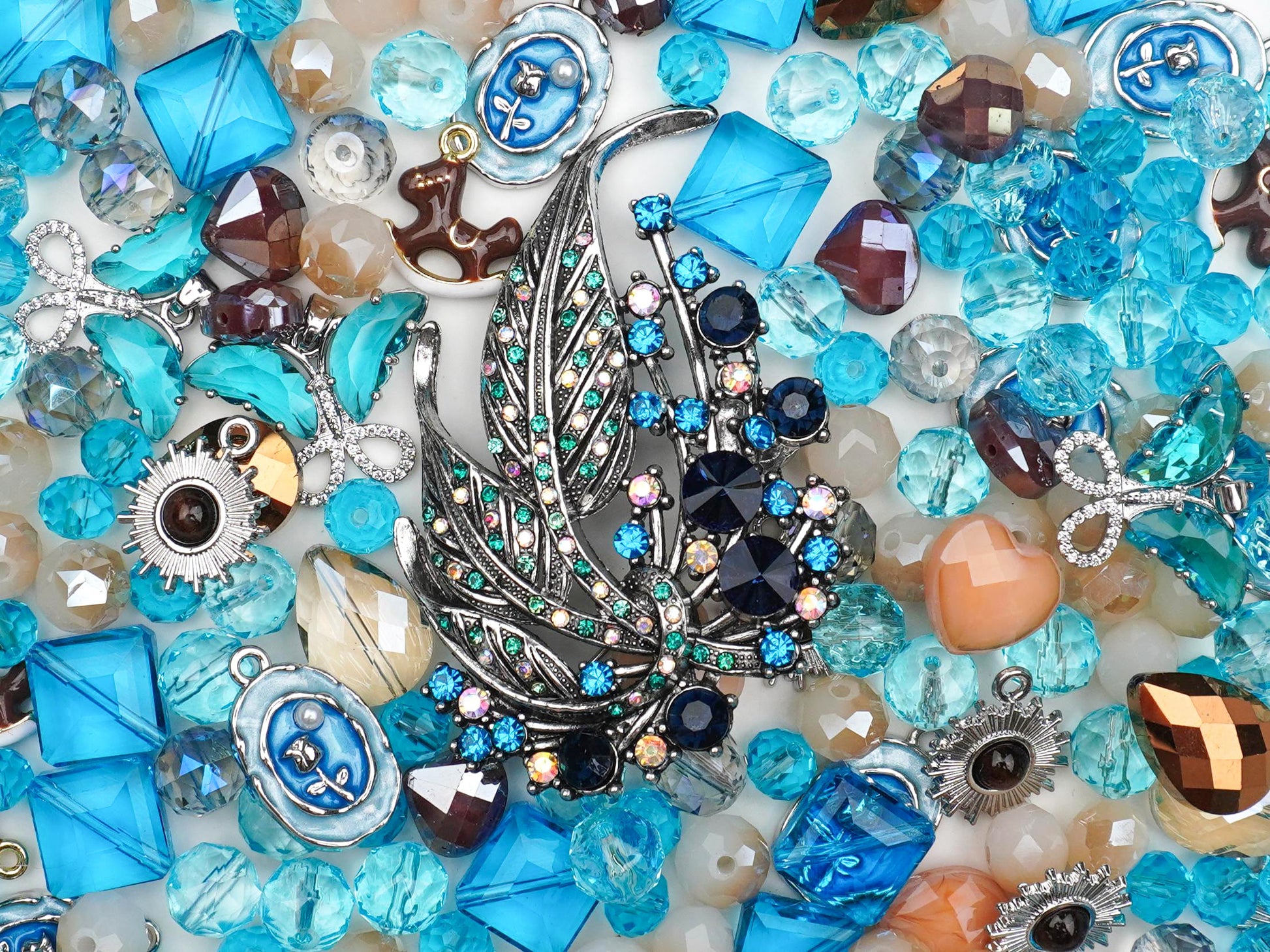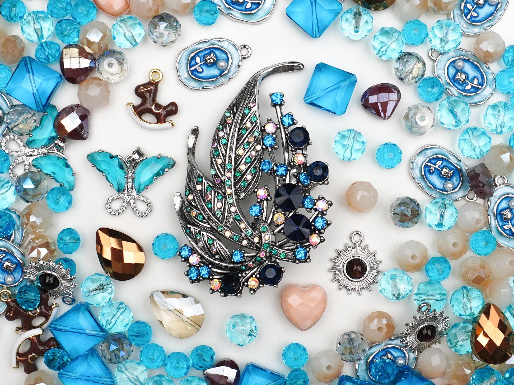 Escape into your own A Quiet Corner with this ultra-chic charm mix that is literally giving Vogue cover energy! 🌿💎 This collection centers around a breathtaking, jewel-toned silver leaf branch surrounded by a dreamy palette of ocean blues, soft peach, and warm bronze crystals that feel like a peaceful sunset. It’s the perfect blend of high-fashion glam and serene nature vibes, featuring hand-painted rose cameos and celestial sunbursts to help you craft your joy and turn your DIY designs into total statement pieces. ☁️✨