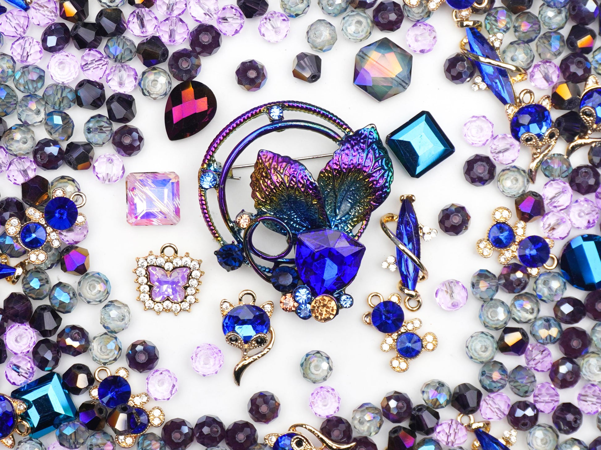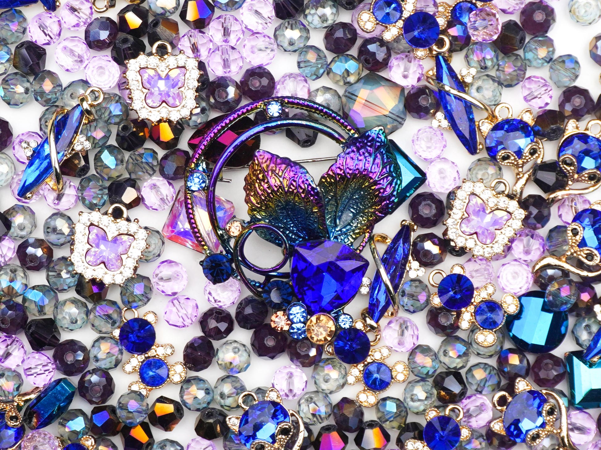 The star of the show is an iridescent floral focal with a royal blue heart, looking like a rare treasure found at a 1960s boutique. 🦊✨ We’ve added a sleek sapphire fox, a dainty crystal butterfly, and holographic squares that change color with every move. Every bead—from the deep violet bicones to the shimmering blue rounds—is picked to give you that authentic heirloom feel with a modern "it-girl" twist.