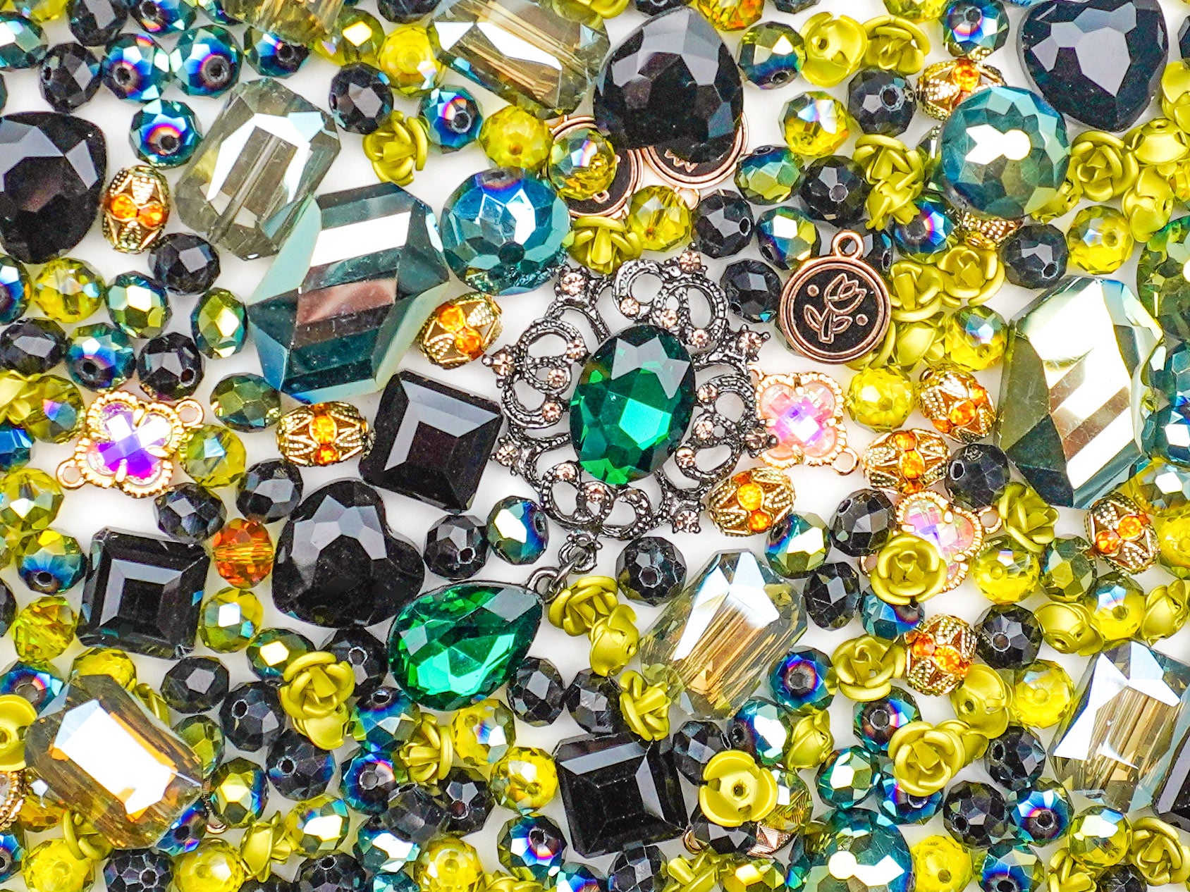 Featuring striking faceted gems, glossy black hearts, neon-green florals, and statement centerpiece charms, this set captures the pulse of urban fashion. The mix blends luxury and attitude, giving your DIY jewelry a look that’s effortlessly stylish but still full of personality. Think street-style confidence with a touch of runway drama. ⚡🖤