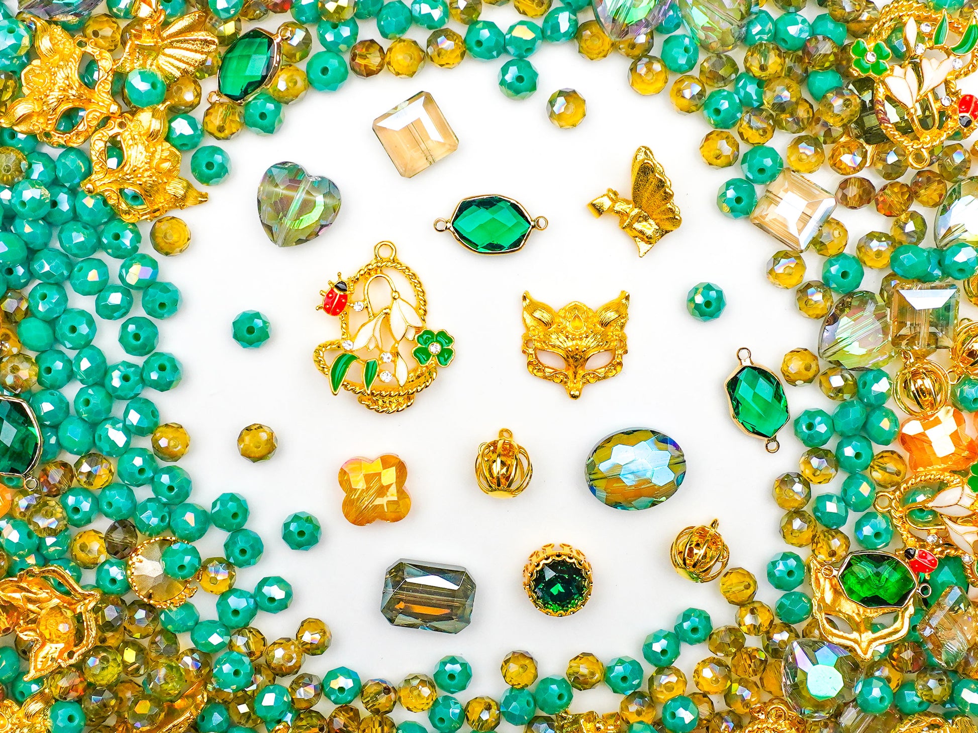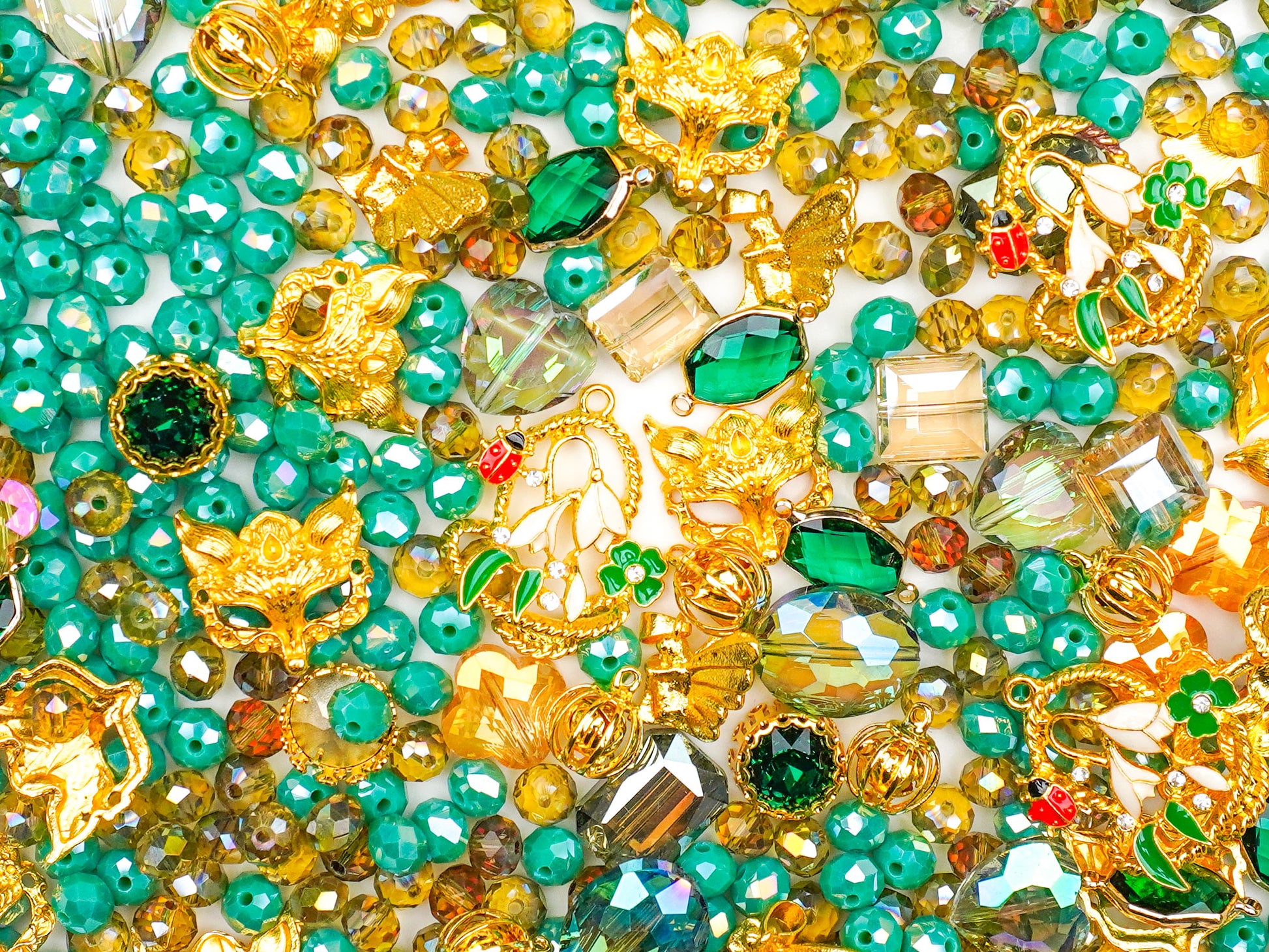 Masquerade Mood brings the magic of costume nights into your DIY world. With gleaming emerald greens, golden mask charms, and sparkling faceted beads, this mix feels like stepping into a hidden ballroom where every detail glows. The fox-mask charms and vintage-gold accents instantly give that mysterious, dressed-to-impress energy.