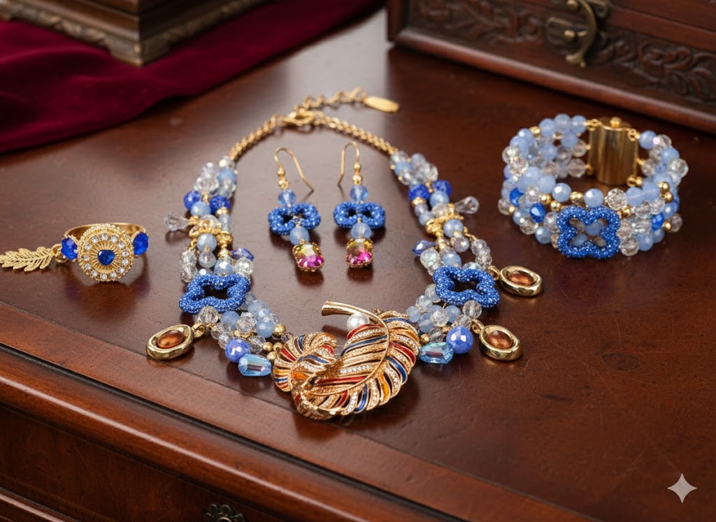 Enter your Golden Era with "The Feather" mix! 🪶✨ This collection serves major Art Deco luxury, featuring a statement crystal-encrusted feather brooch and royal blue clover frames that scream "Old Money" aesthetic.