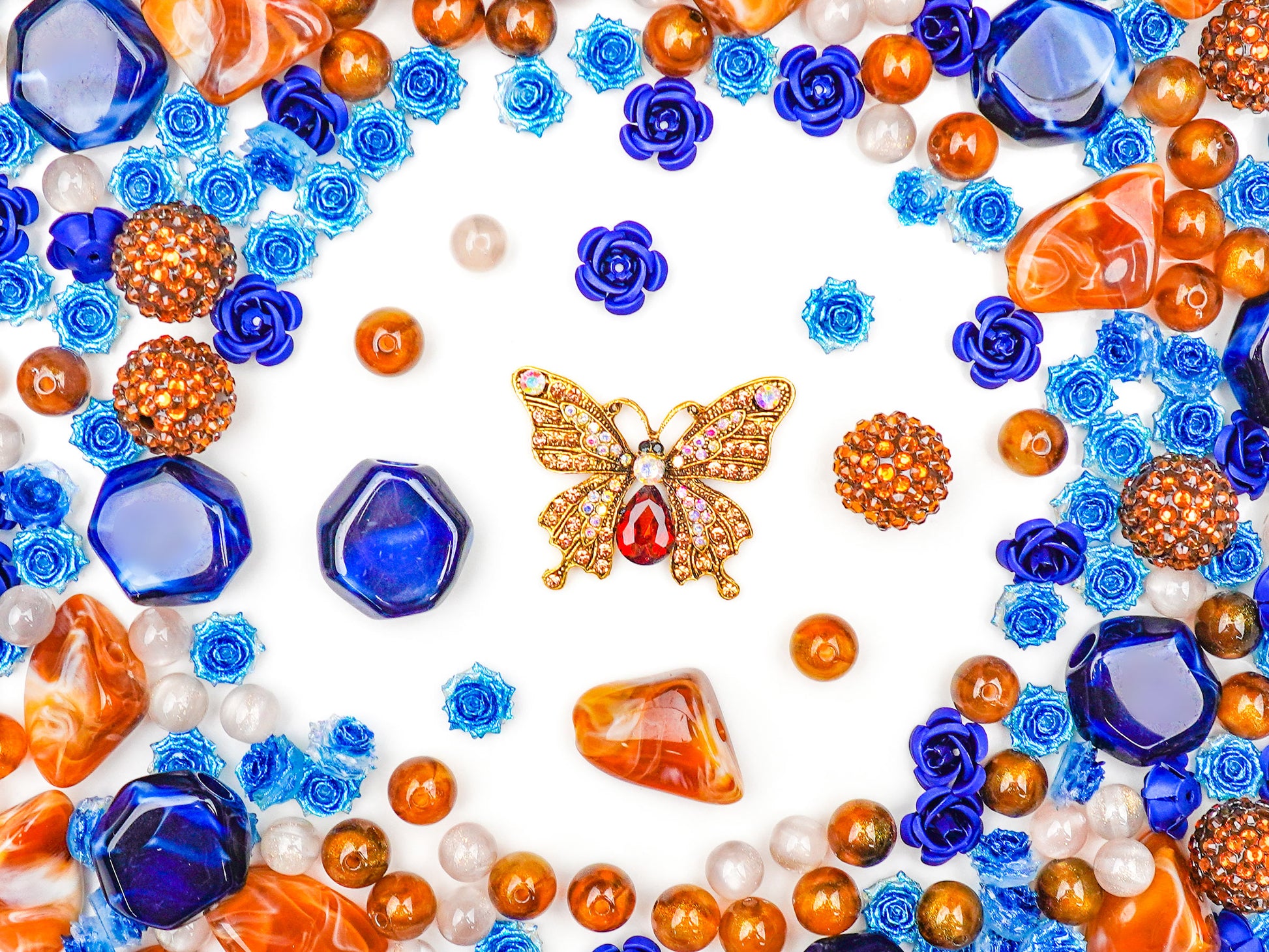 At the center, a jeweled butterfly adds a luxe, high-fashion sparkle, tying the whole story together with a touch of elegance. Surrounding it are cobalt roses, amber spheres, and faceted navy gems that make every angle glow. The palette is bold but comforting, giving your creations that chic, editorial vibe.