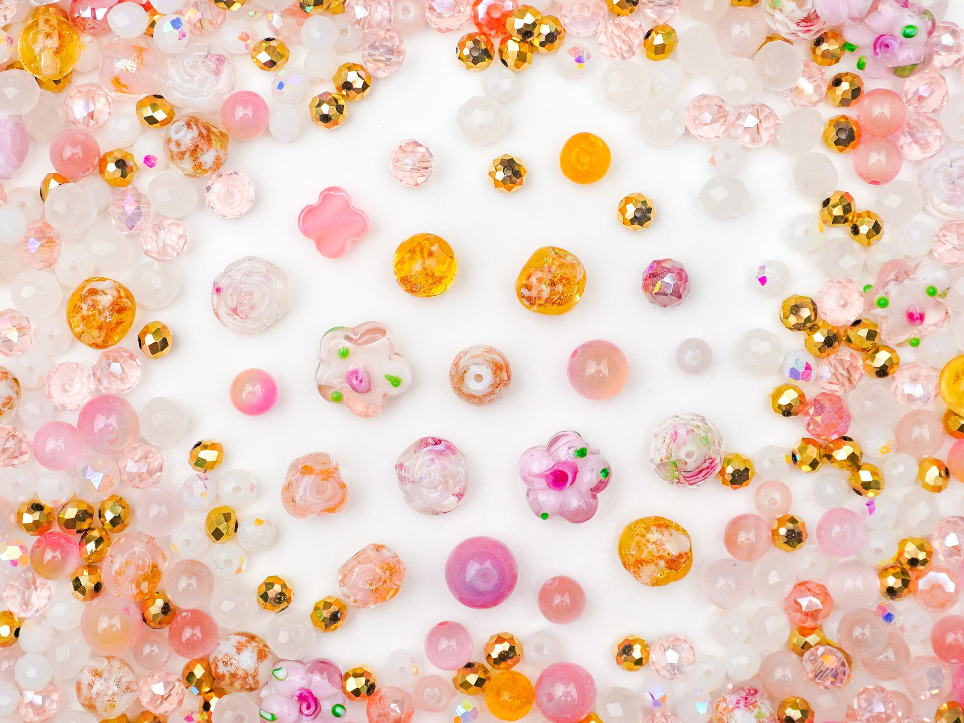 Sweet Haze is a dreamy pastel wonderland where soft pinks, glowing oranges, and warm golds melt together like a candy-colored sunrise. 🍬✨ The mix features delicate glass florals, glossy beads, and translucent spheres that shimmer under the light — each piece capturing the essence of gentle sweetness and effortless charm. 🌸💛