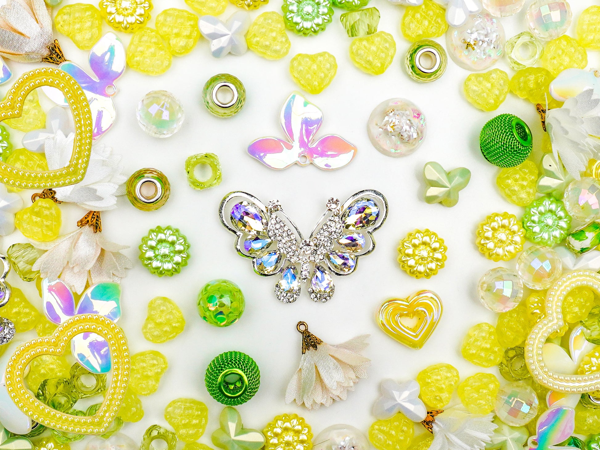 Fresh Day brings the soft glow of morning sunshine to your creations with its bright lemon-yellow palette, crystal-clear accents, and dreamy iridescent butterflies. The central rhinestone butterfly charm gives the whole mix a polished, Vogue-worthy sparkle, while mini heart beads, floral pieces, and soft tassels add a refreshing, playful vibe. 🌿💛