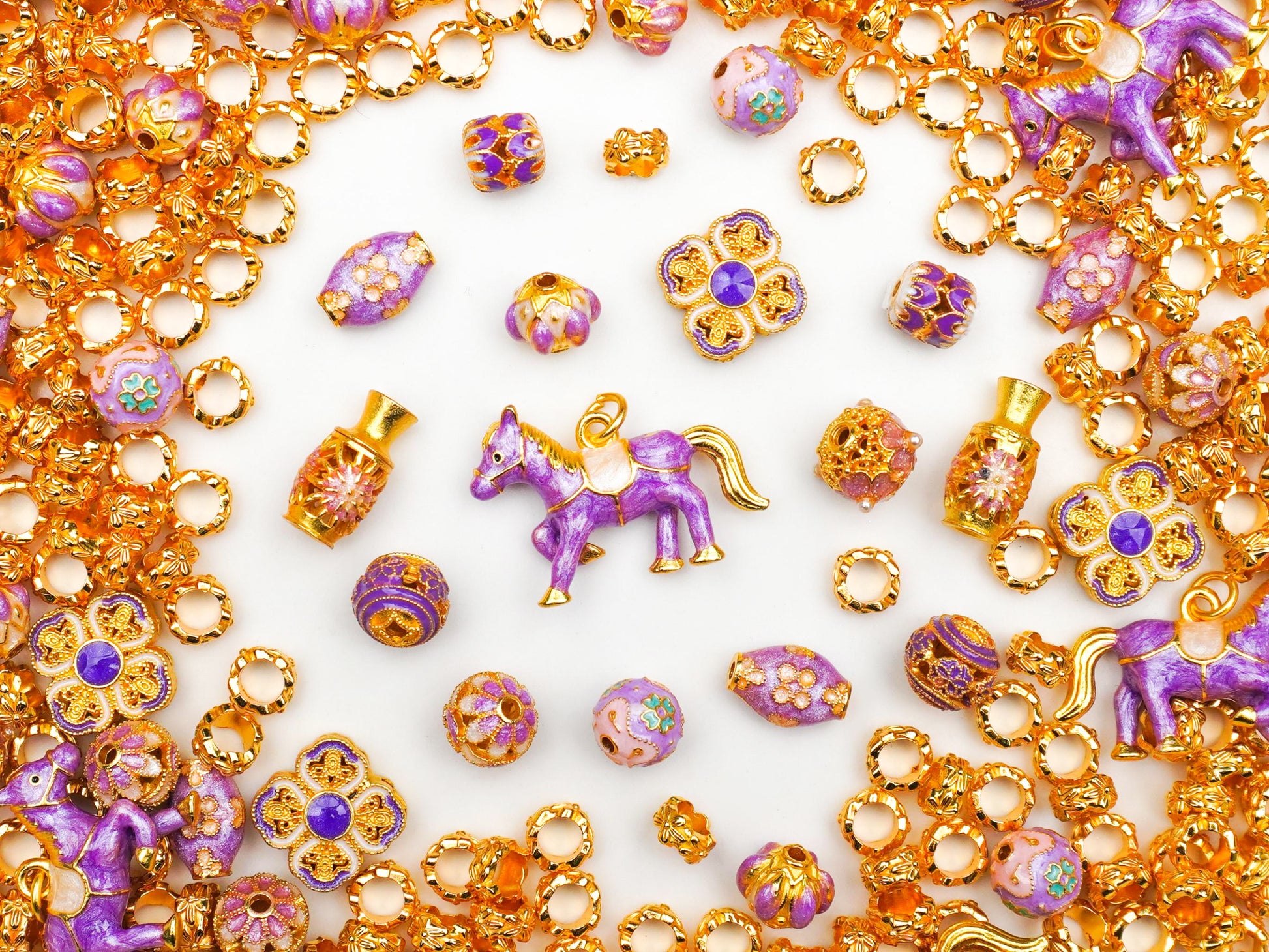 Step into your royal era with Vintage Dreamscape, a charm mix designed for the ultimate main character energy. 👑 This collection blends the opulence of a gilded palace with a whimsical, dreamy twist—think "Coquette meets High-Fashion." Featuring stunning violet enameled ponies and intricate gold floral medallions, every piece feels like a curated treasure found in a hidden vintage vault. 💜