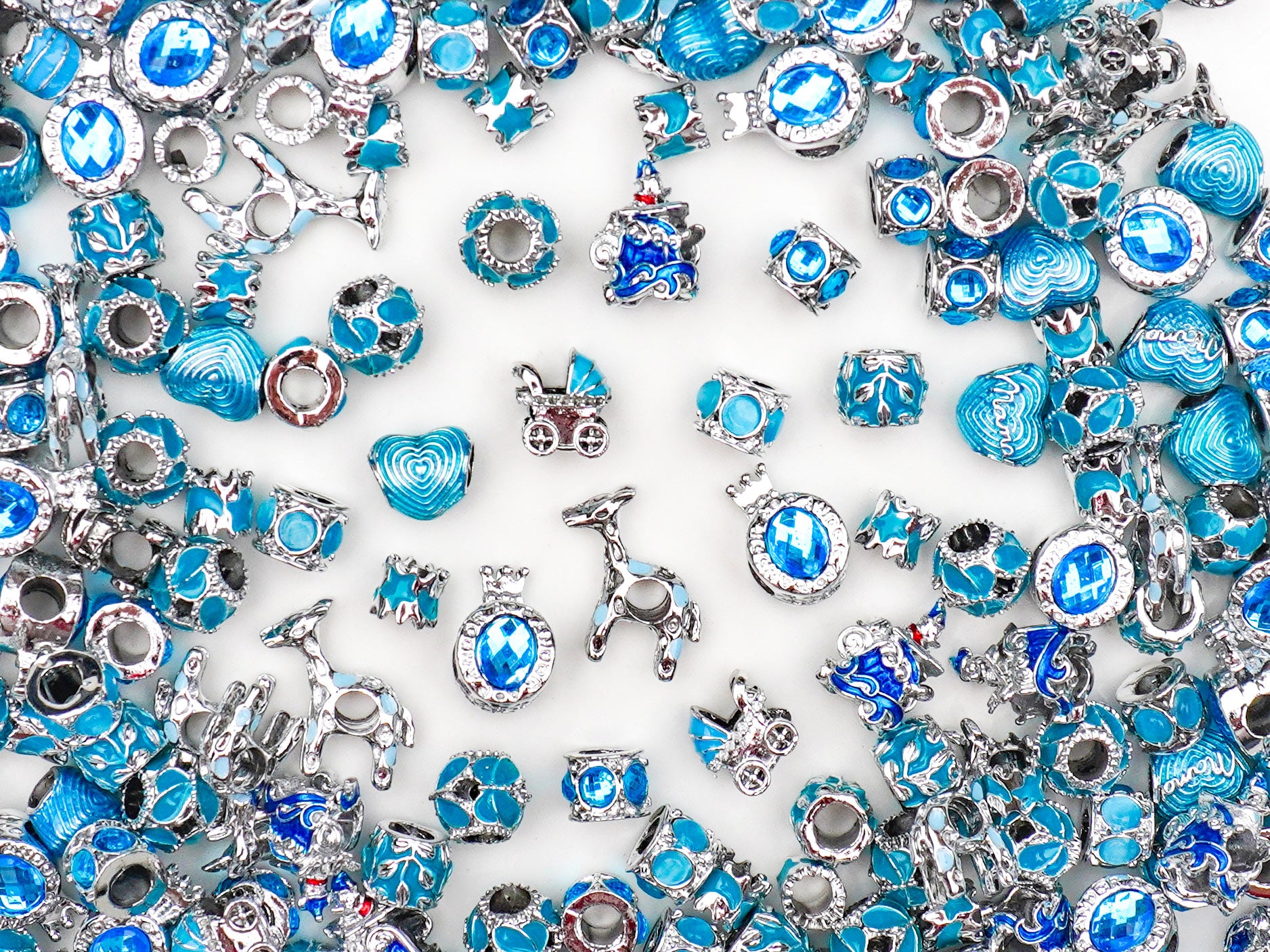 Blue Belle captures the magic of elegance and wonder 💙✨. A dreamy mix of icy blues and silvery tones, this collection radiates cool sophistication with a hint of fairytale charm. Each piece — from crystal carriage charms and crowns to delicate deer and heart beads — evokes the grace of a modern princess with timeless style.